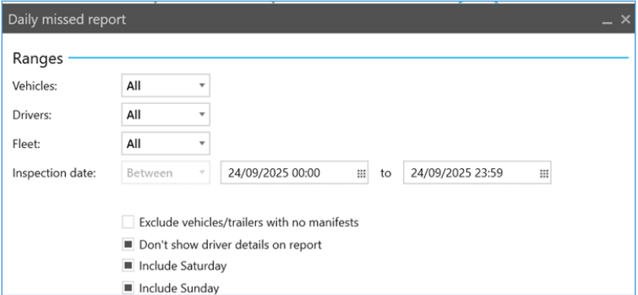 The daily missed report did not respect the time settings on the date ranges. This meant that if a vehicle has been inspected at any time during a day it would not be included in the report.